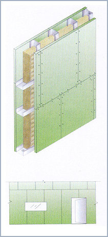 安裝方法 一、輕鋼龍骨骨架 1、放樣彈線 2、用射釘或膊脹螺絲將龍骨分別目定在地板與頂部樓板 3、將整龍骨按設(shè)計要求(一船612mm)排列好,井安裝好橫撐龍骨 二、板材封裝固定 1、先將材板切至所需尺寸(比墻高短10mm左右) 2、板材以錯縫的方式用自攻蜂絲固定在龍骨上,自攻螺絲間距一般為200-250mm左右,需沉入板面0.5mm 3、注意板與板之間需留4mm左右伸縮縫。 4、封板應(yīng)從板中向板四周固定,不可多點同時作業(yè),避免產(chǎn)生內(nèi)應(yīng)力而使板材扭曲 5、在板材封裝固定前,視需要可在龍骨骨架空腔內(nèi)部置入玻璃棉或巖棉等以加強隔音,防火效果。 墻體應(yīng)用設(shè)計指南 · 輕鋼龍骨墻體主要用于內(nèi)隔墻。當用于分戶墻、走道、樓梯間等對隔聲、防火、防水、防盜及耐久性要求較高的部位時,應(yīng)慎重選用板材品種和合理的墻體構(gòu)造。(請與我司技術(shù)支持部聯(lián)系) · 墻體連續(xù)長度不宜大于25m,超過時可設(shè)置伸縮縫。 · 墻體的適用高度與龍骨的品種,截面尺寸和間距有關(guān),請參照上述《常用輕鋼龍骨限制高度表》及說明。龍骨與建筑結(jié)構(gòu)應(yīng)連接牢固。龍骨的邊框與建筑結(jié)構(gòu)的連接可采用膨脹螺栓或射釘固定,間距不宜大于800mm。為加強墻體剛度而采用通貫龍骨時,其間距不宜大干1500mm。豎龍骨與橫龍骨連接采用直徑為4mm,長度為8mm的抽芯鉚釘,或用專用的龍骨鉗固定。 · 板用自攻螺絲固定在龍骨上。如無說明,自攻螺絲的規(guī)格一般為直徑3.5~4mm,長度25~35mm。 · 墻體與梁、板、墻、柱應(yīng)連接牢固,結(jié)合處應(yīng)緊密相連無縫隙,采用與板材相適應(yīng)的膩子或密封嵌縫粘結(jié)材料填實、刮平并貼防裂帶蓋縫。 · 對防火要求較高的墻體須采用防火性能較高的板材系列。 · 有防水要求時,應(yīng)選用防水性能較高的易和利保板,墻面做防水處理以加強產(chǎn)品的耐久性。在墻腳處應(yīng)設(shè)100mm高的細石混凝土墻墊,墻墊也應(yīng)作防水處理。 · 墻體面板可吊掛10kg以下的物件。吊件固定在龍骨上時可增加吊掛能力。如需吊掛重物時,需加密的排布及增加鋼(木)墊板或趕增加鋼(木)墊板或角鋼及連接構(gòu)件,將荷載傳遞到龍骨骨架上,防止面板受損。 | |